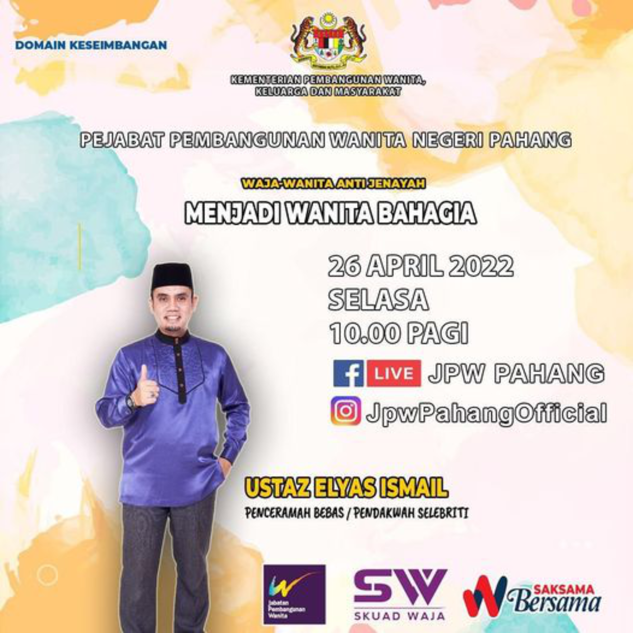 Pejabat Pembangunan Wanita Negeri Pahang akan mengadakan Program di bawah *Domain Keseimbangan : Wanita Anti Jenayah* secara atas talian seperti berikut: