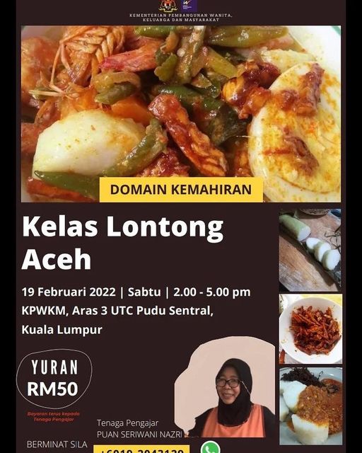 📍PROGRAM : KELAS LONTONG ACEH | TARIKH : 19 FEBRUARI 2022 | MASA : 2.00 - 5.00 PETANG | YURAN : RM50.00 (bayaran terus kpd Tenaga Pengajar) | TEMPAT : KPWKM, Aras 3 Bangunan UTC Pudu Sentral Kuala Lumpur